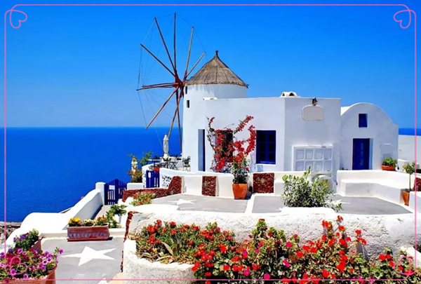 藍色的教堂穹頂,白色的瓦墻,愛琴海的風(fēng)撥動人的心房。風(fēng)車、落日、教堂,這就是專屬于圣托里尼的希臘風(fēng)情。