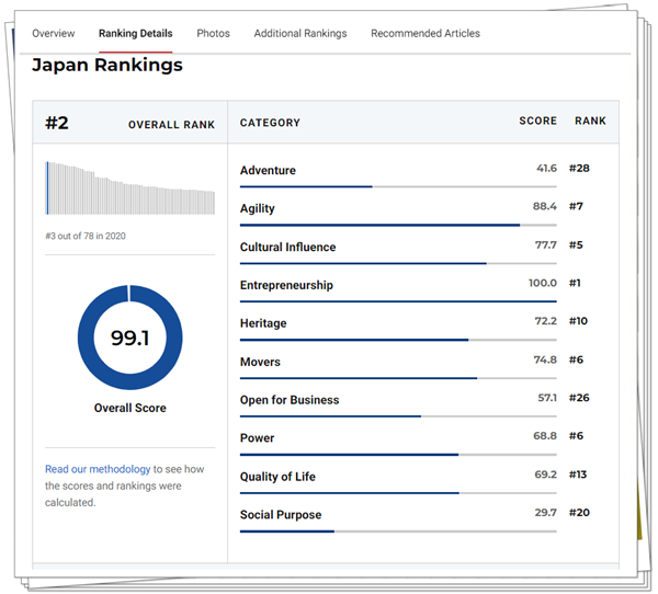 4月13日,權(quán)威機(jī)構(gòu)《美國新聞與世界報(bào)道》(US News & World Report)發(fā)布了《2021年全球最佳國家排行榜》,根據(jù)慣例,這份榜單由BAV集團(tuán)和美國賓夕法尼亞大學(xué)沃頓商學(xué)院(Wharton School)共同研究整理。榜單顯示,即使在疫情的特殊情況下,日本仍憑借其過硬的實(shí)力晉升1位,躋身全球第2!